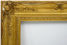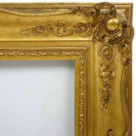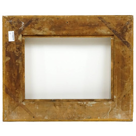 Cornice del XIX secolo in legno e stucco dorato, profilo interno a fogliette stilizzate, quattro angoli ornati da motivi di cartigli con volute, grifoni e fiori, misure ingombro cm 60x73, battuta cm 37x50,5, (difetti)