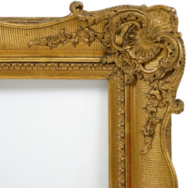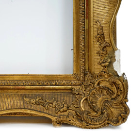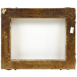 Cornice del XIX secolo in legno intagliato e dorato, fascia con decori incisi e cespi fogliacei angolari di gusto rocaille, cm 64x76, battuta cm 44x57, (difetti)