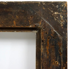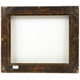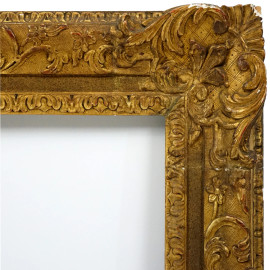 Cornice del XIX secolo, in legno intagliato e dorato, fascia con ricco decoro di gusto rocaille a rilievo, misure ingombro cm 80x70, battuta cm 62,5x52, (difetti)