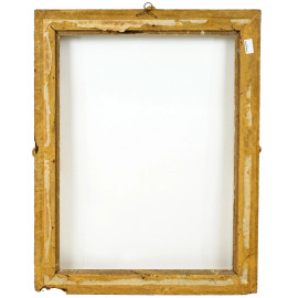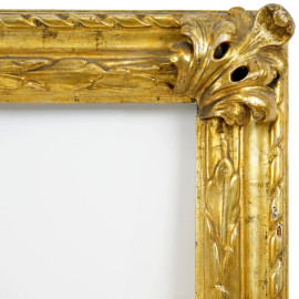 Cornice del XVIII secolo, in legno intagliato e dorato, battuta interna scolpita a foglie ricorrenti, seguita da gola liscia e cordonetto, angoli e centri a grandi foglie d'acanto aperte rivolte verso l'esterno, misure ingombro cm 117x93, battuta cm 99x74, (difetti)