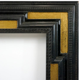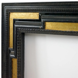Cornice del XX secolo in legno ebanizzato e parzialmente dorato, lavorata a guilloché, misure ingombro cm 98x78, battuta 70,5x50, (difetti)