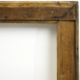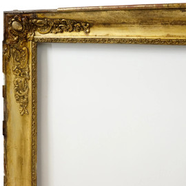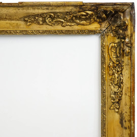 Cornice in legno dorato del XIX secolo, decorata da fregi angolari a motivi rocaille, misure ingombro cm 130x101,5, misure battente cm 115x86, (difetti e mancanze)