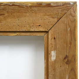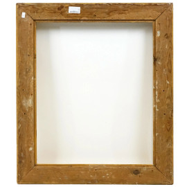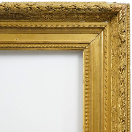 Cornice in legno dorato, inizi XX secolo, battuta interna a perline seguita da fascia liscia e piccola gola delimitata da nastro arrotolato, battuta esterna intagliata a motivi di ghirlanda a foglie d'alloro con bacche, misure ingombro cm 78x92, misure battuta cm 60,5x73,5, (difetti)