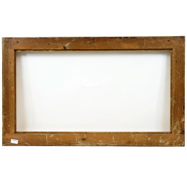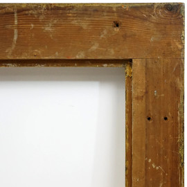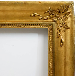 Cornice in legno dorato, XIX secolo, profilo interno a foglie lanceolate seguito da gola liscia che si porta agli angoli con decori di foglie d'acanto e bacche, misure ingombro cm 147x88, misure battente cm 127x68, (difetti)