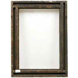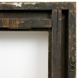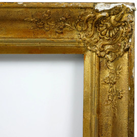 Cornice in legno e stucco dorato, fine XIX secolo, angoli con decori ad acroterio e motivi rocaille, misure ingombro cm 92x68, misure battuta cm 50,5x75, (difetti)