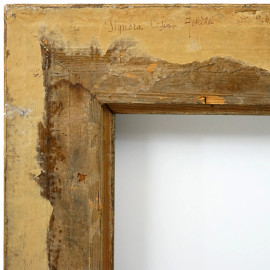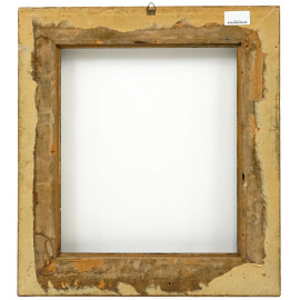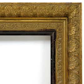 Cornice in legno e stucco dorato, inizi XX secolo, battuta interna ebanizzata seguita da piccola fascia a motivi floreali e foglie d'edera, battuta esterna a palmette, misure ingombro cm 67x59, misure battente cm 49x41,5, (difetti)