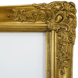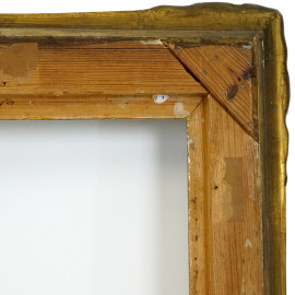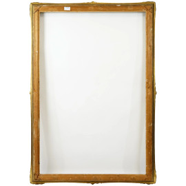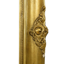 Cornice in legno e stucco dorato, XX secolo, fascia liscia con angoli e centri a cespi fogliacei e motivi rocaille, misure ingombro cm 178x124, misure battuta cm 105,5x160, (difetti)