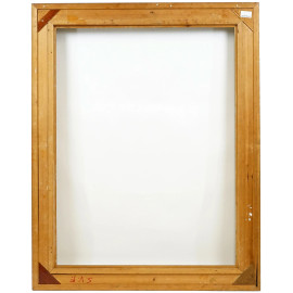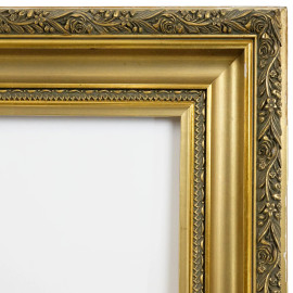 Cornice in legno e stucco dorato, XX secolo, profilo interno a fogliette seguito da gola liscia, profilo esterno aggettante intagliato a foggia di tralci con rose, misure ingombro cm 148x118, misure battuta cm 124,5x95, (difetti)