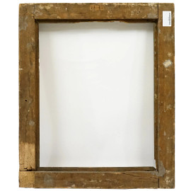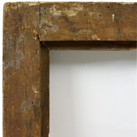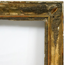 Cornice in legno e stucco, XIX secolo, profilo interno a motivi floreali che si porta su fascia liscia con decori angolari rocaille, bordo aggettante, misure ingombro cm 71x58, misure battuta cm 57,5x46, (difetti)