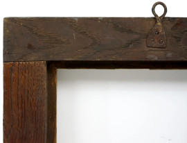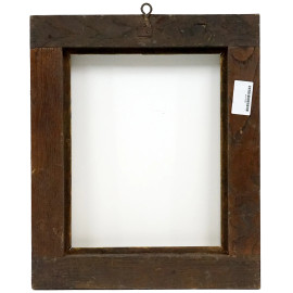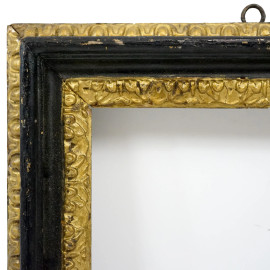 Cornice in legno ebanizzato e dorato, XIX secolo, battuta interna a foglie seguita da fascia modanata nera che digrada a muro e termina con un controprofilo dorato a ovoli, misure ingombro cm 46,5x39, battuta cm 35,5x28, (difetti)