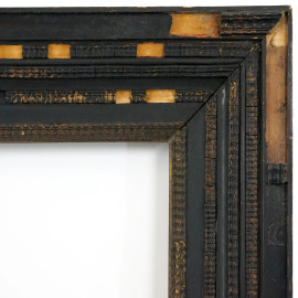 Cornice in legno ebanizzato, XIX secolo, battute a guilloché intervallate da gole lisce, misure ingombro cm 119X153, misure battuta cm 96X131, (difetti, parti mancanti)