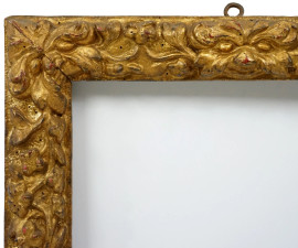 Cornice in legno intagliato e dorato, XIX secolo, battuta riccamente scolpita con angoli e centri a mascheroni mimetizzati tra i tralci vegetali, misure ingombro cm 61x47, battuta cm 51x36,5