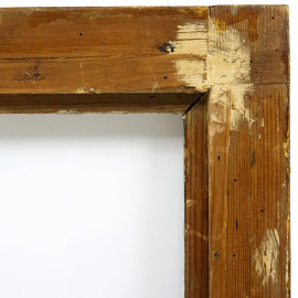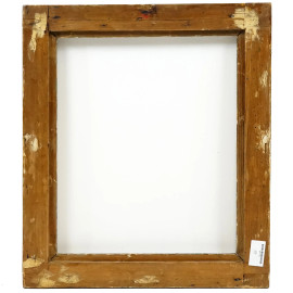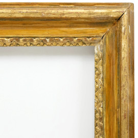 Cornice in legno intagliato e dorato, XIX secolo, profilo interno mosso, seguito da gola liscia e battuta esterna a rilievo, ingombro cm 63,5x55, battuta cm 51,5x43,5, (difetti)