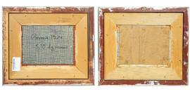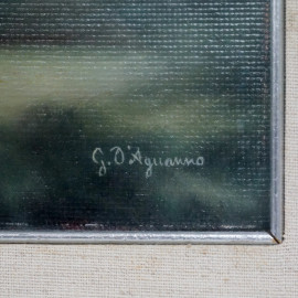 Due dipinti realizzati ad olio su cartone telato raffiguranti spiaggia e scorcio lacustre, cm 15,5x21, firmati D'Aguanno, entro cornici.