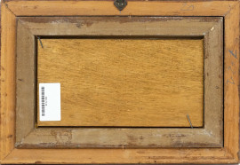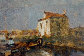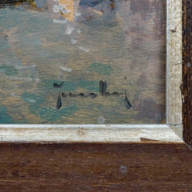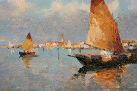 Laguna veneta con imbarcazioni, olio su compensato, cm 13,5x25, firmato, entro cornice.