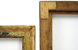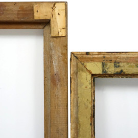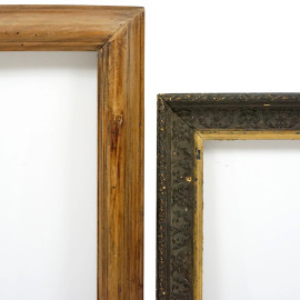 Lotto di due cornici diverse in legno intagliato ed ebanizzato, XX secolo, misure ingombro max cm 52x48, (difetti)