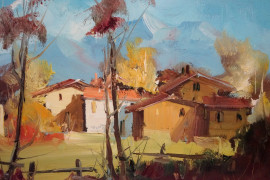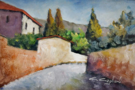 Lotto di due dipinti ad olio su tela raffiguranti paesaggio e viale urbano, cm 30x39,5, firmati, entro cornici.