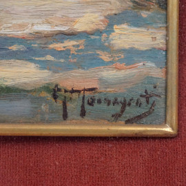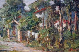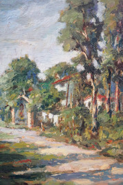 Paesaggio con case, olio su tavola, cm 22,5x14,5, firmato, entro cornice