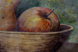 Natura morta - Cesta con pere, olio su tela, cm 25x35, siglato, entro cornice.