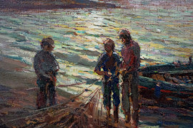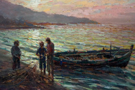 Pesca al tramonto, olio su tavoletta, cm 20x30, firmato, entro cornice.