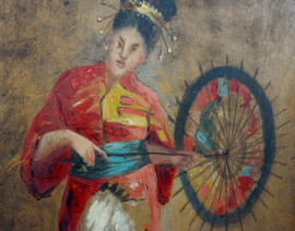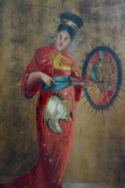 Pittore francese, inizi XX secolo, bozzetto raffigurante donna giapponese con parasole, olio su tavola, cm 32x21, (difetti)