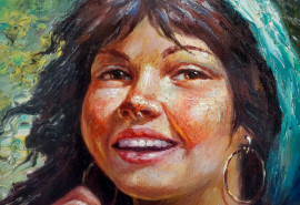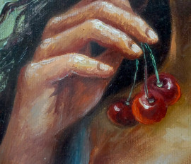 Popolana con ciliegie, olio su tela, cm 50x40, firmato, entro cornice.