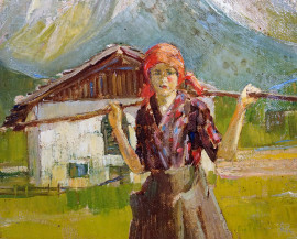 Popolana, olio su cartone telato, cm 35x30, firmato, entro cornice.