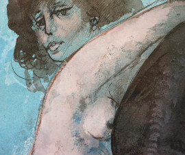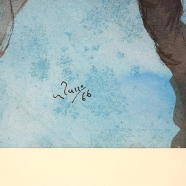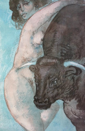 Donna con toro, tecnica mista su carta, cm 32x23, entro cornice