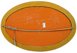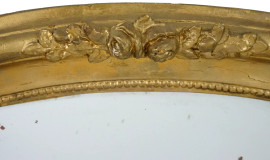 Specchiera ovale in legno e stucco dorato, fine XIX-inizi XX secolo, profilo interno perlinato seguito da fascia modanata ornata da fregi floreali a rilievo, cm 66x98, (difetti)