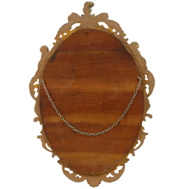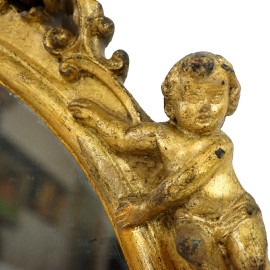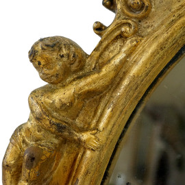 Specchiera ovale in legno intagliato e dorato, fine XIX- inizi XX secolo, cornice circondata da volute terminanti in un'ampia cimasa scolpita a volute sostenuta da coppia di puttini ai lati, cm 89x59, (difetti)
