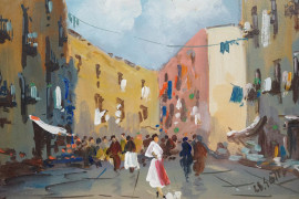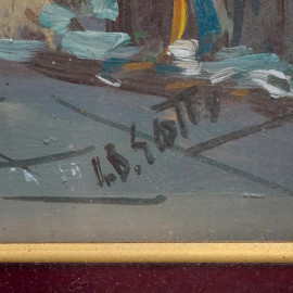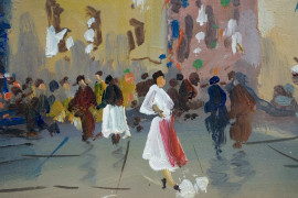 Strada con figure, olio su compensato, cm 17x27, firmato, entro cornice.