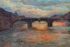 Tevere al tramonto, olio su cartone, cm 7,3x10,5, firmato, entro cornice