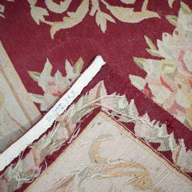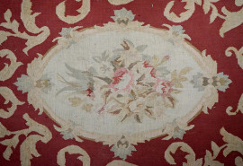 Tre tappeti Abousson ricamati a medaglioni su fondo color avana, entro bordure nei toni del rosso, misure max cm 308x93, (difetti)