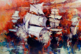 Velieri, olio su tela, cm 130x179.5, firmato e datato, entro cornice