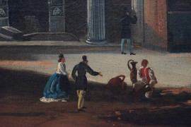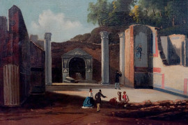 Visitatori del Grand Tour a Pompei - Casa di Helvius Vestalis, olio su tela, cm 35x50, seconda metà XIX secolo, entro cornice.