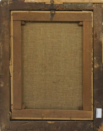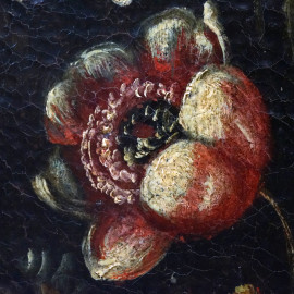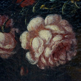 sontuosa composizione di fiori, su un fondo bruno su cui spiccano le corolle policrome di rari tulipani, rose e campanule.