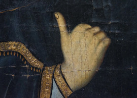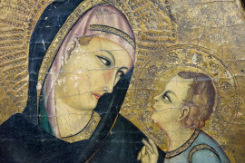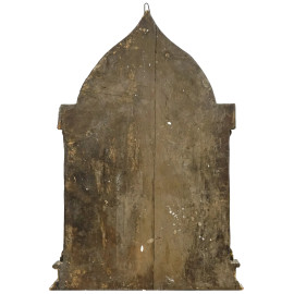 Ambrogio Lorenzetti (Siena, 1290 circa – Siena, 9 giugno 1348) copia da, Madonna del Tramonto, dipinto ad olio su tavola, cm 55,5X38, XIX secolo, entro cornice con sommità ad arco inflesso sostenuta da coppia di colonnine tortili, (difetti e restauri)