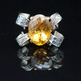 Anello in oro basso e argento con quarzo, diamanti e zaffiri, misura n. 17, peso gr. 49,5