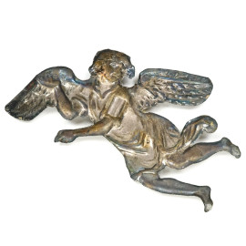 Angelo realizzato in lamina d'argento incisa e sbalzata, cm 7,5x14, XIX secolo, peso gr. 20