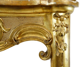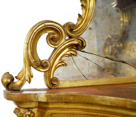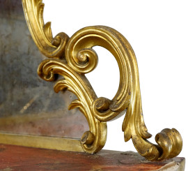 Angoliera in legno intagliato e dorato, XIX secolo, parte superiore a due pianetti sagomati con fondo specchiato, particolari intagliati a foggia di nastri, ingombro cm h 194x84x60, (difetti)