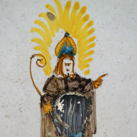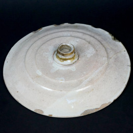 Antica alzatina in maiolica policroma, cavetto raffigurante figura di vescovo in stile compendiario, cm h 6x25, (difetti, restauri e parte centrale dell'alzata sostituita)