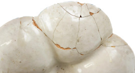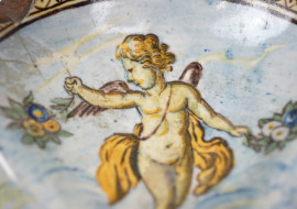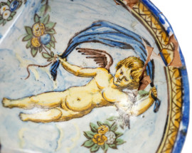 Antica crespina in maiolica dipinta in policromia con vaschette decorate a motivo di putti alati con festoni, cm h 4x24, (difetti e restauri)
