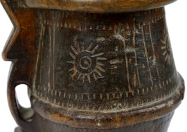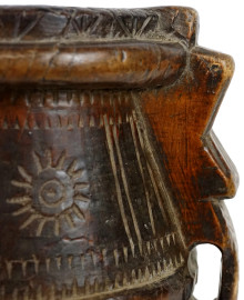 Antico boccale in legno intagliato ed inciso, cm h 28, (difetti)