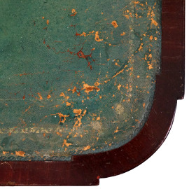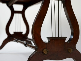 Basso tavolo in mogano, XIX secolo, piano sostenuto da montanti laterali a lira riuniti da doppia traversa, cm h 45x91,5x38, (difetti)