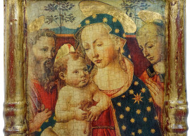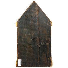 Biagio Antonio Tucci (14-1516) copia da, Madonna con Bambino, edicola in legno scolpito e dorato con oleografia a colori inquadrata da coppia di colonnine, ingombro cm 60,5x34, inizi XX secolo, (difetti)