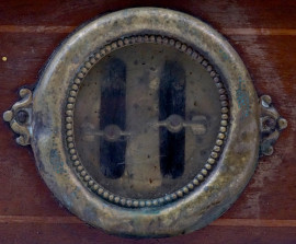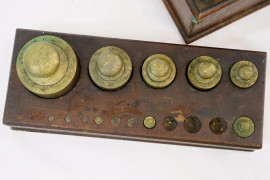 Bilancia in legno, XIX secolo, piatti in ottone, completa di nove pesi, cm h 25x80x30,5, (difetti e mancanti alcuni pesi)