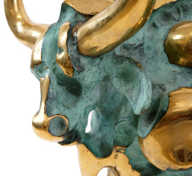 Toro, scultura in bronzo ossidato e parzialmente dorato, cm h 53x80, firma a tergo.