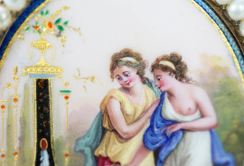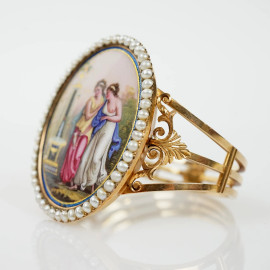 Bracciale in oro 18 KT centrato da medaglione ovale raffigurante "Fanciulle alla fonte dell'Amore" realizzato a smalti policromi e particolari dorati, profilo a perline, XIX secolo, cm 6x6,5x6,5, peso lordo gr.46,4 circa, entro cofanetto, (lievi difetti).
