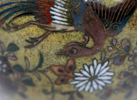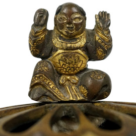 Brucia profumi a smalti cloisonné con coperchio traforato, presa a foggia di buddha seduto, corpo sagomato lavorato a foggia di fenici e motivi floreali, cm h 13,5x10, Giappone, XX secolo.