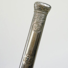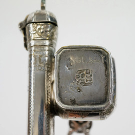 Calamaio arabo in metallo argentato, inscrizione e decori incisi, cm h 6x28x6, XIX secolo, (difetti)